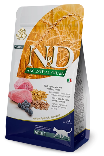 Jagnjetina, spelta, ovas i borovnica. Kompletna hrana za odrasle mačke.