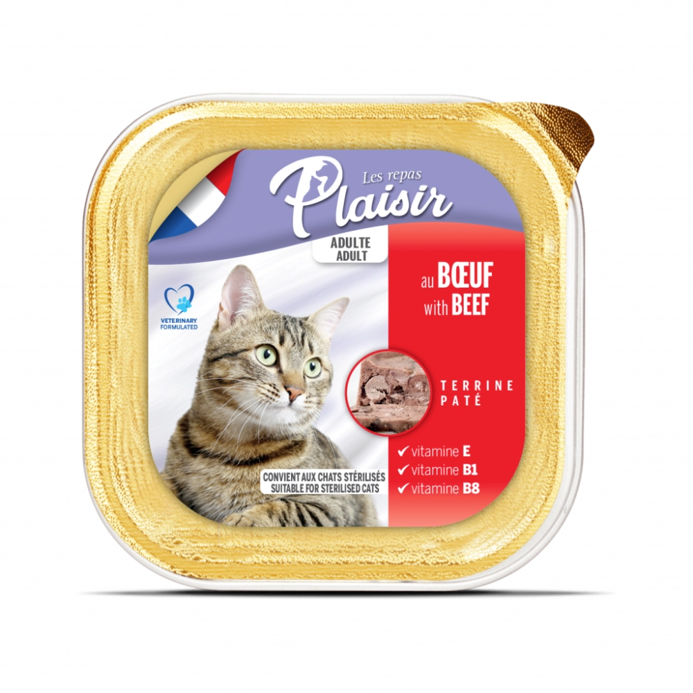 Plaisir paštete sa govedinom sadrže 56% mesa i životinjskih derivata, od čega je 4% goveđe meso. Ovo obezbeđuje vašoj mački dovoljno visok unos proteina da zadovolji njene dnevne potrebe. Namenjeni su sterilisanim odraslim mačkama, zahvaljujući malom sadržaju masti.