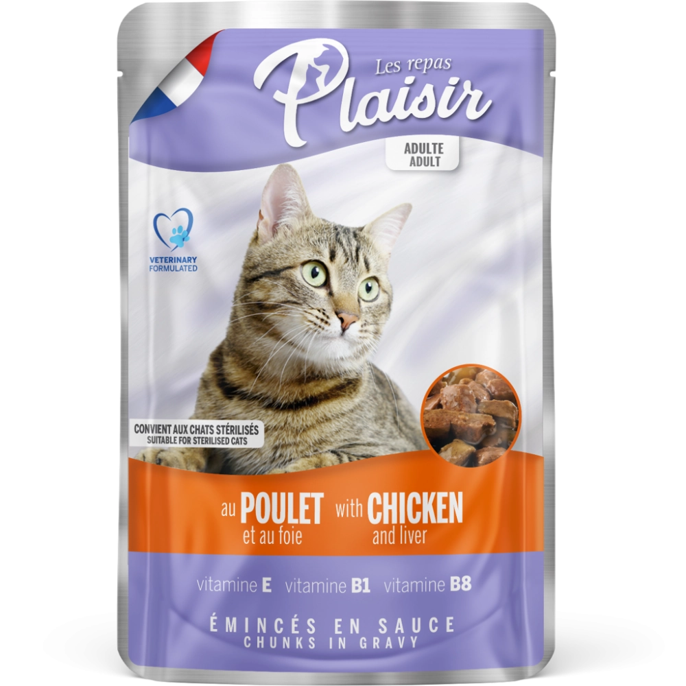 Omiljeni recept mačaka! Duo komadića sa piletinom i jetrom koji oduševljava njihovo fino nepce. Odabirom Les Repas Plaisir, sigurno će mu se svideti: potpuna i uravnotežena ishrana, formulisana od strane veterinara, koja nudi različite teksture i ukuse, i napravljena u Francuskoj. Bez bojenja. Pogodno za sterilisane odrasle mačke.