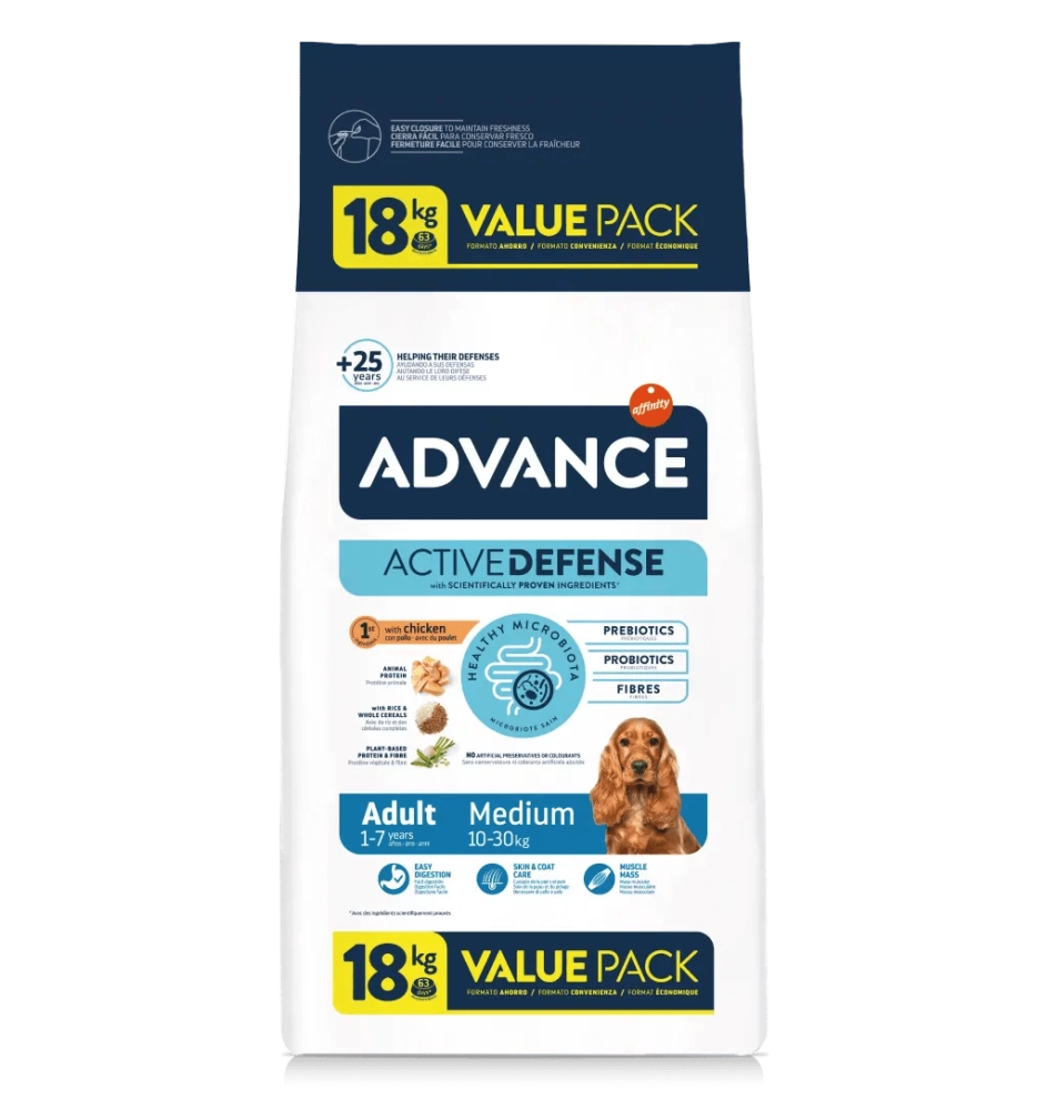 Advance Adult Medium je visokokvalitetna hrana koja je lako svarljiva i formulisana da zadovolji potrebe srednjih odraslih pasa. Napravljen sa piletinom kao prvim sastojkom. Pomaže u održavanju mišićne mase, zahvaljujući nivou visokokvalitetnih proteina i doprinosi zdravoj koži i sjajnoj dlaki, zahvaljujući omega 3 i omega 6 masnim kiselinama.