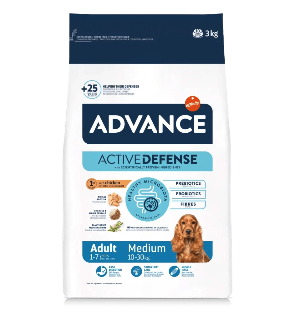 Advance Adult Medium je visokokvalitetna hrana koja je lako svarljiva i formulisana da zadovolji potrebe srednjih odraslih pasa. Napravljen sa piletinom kao prvim sastojkom. Pomaže u održavanju mišićne mase, zahvaljujući nivou visokokvalitetnih proteina i doprinosi zdravoj koži i sjajnoj dlaki, zahvaljujući omega 3 i omega 6 masnim kiselinama