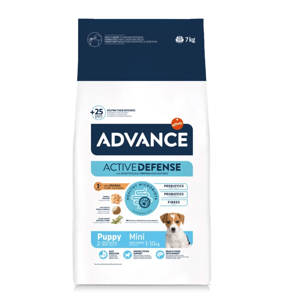 Advance Puppi Mini je posebno formulisan da zadovolji potrebe štenaca u ishrani. Hrana je lako svarljiva i doprinosi normalnom razvoju mozga i vida, kao i optimalnom rastu kostiju vašeg šteneta, zahvaljujući omega 3 masnim kiselinama, vitaminima i mineralima.