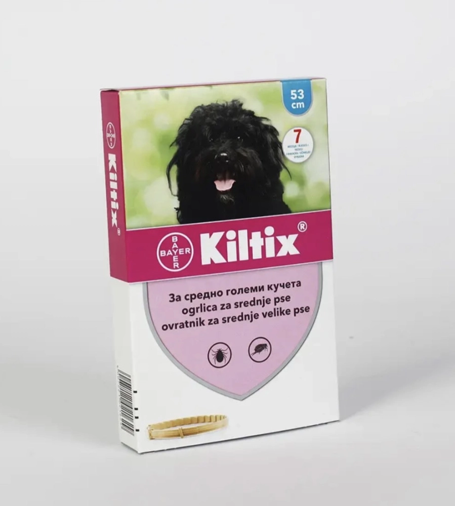 – Suzbijanje i sprečavanje infestacije buvama (Ctenocephalides felis) tokom 7 meseci-Pomoć u suzbijanju i lečenju alergijskog dermatitisa uzrokovanog ugrizima buva-Suzbijanje i sprečavanje infestacije krpeljima (Ixodes ricinus) – repelentni efekat- tokom 7 meseci Način primene i dozeKiltix ogrlica se izvadi iz kutije i odmota. Zatim se sa unutrašnje strane ogrlice skinu plastični držači. Ogrlica se psu stavi labavo oko vrata (ne sme se stegnuti), a suvišni deo trake provuče se kroz kopču. Dobro je stavljena ona ogrlica koja životinji ne smeta, a između njega i vrata mogu se ugurati dva prsta.Psi moraju kontinuirano nositi ogrlicu koja djeluje antiparazitski za vreme kretanja i mirovanja. Buve i krpelji počinju ugibati 24 sata nakon stavljanja ogrlice, a ektoparaziticidno dejstvo traje do 7 meseci. KontraindikacijeKiltix ogrlica ne sme se stavljati:- psima s većim oštećenjima kože- bolesnim psima i onima u toku oporavka- štenadi mlađoj od 12 nedelja.-jedinki preosetljivih na aktivne ili pomoćne materije preparata