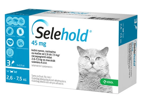 Preparat Selehold® se koristi za: Mačke: - Lečenje i prevencija infestacija buvama uzrokovanih sa Ctenocephalides spp. u trajanju od jednog meseca nakon jedne aplikacije. Ovo je rezultat adulticidnog, larvicidnog i ovicidnog dejstva leka. Lek ima ovicidno dejstvo u trajanju od 3 nedelje nakon aplikacije. U cilju smanjenja populacije buva, mesečni tretman treba sprovoditi i kod gravidnih životinja i životinja u laktaciji, što će delovati preventivno protiv infestacije buvama (legla do 7 nedelja starosti). Lek se može koristiti kao deo strateškog tretmana alergijskog dermatitisa uzrokovanog buvama, a svojim ovicidnim i larvicidnim dejstvom može pomoći u suzbijanju postojeće infestacije buvama u okolini u kojoj životinje borave. - Prevencija srčanog oboljenja uzrokovanog sa Dirofilaria immitis, primenom leka jedanput mesečno. - Lečenje infestacije ušnim šugarcima (Otodectes cynotis) - Lečenje infestacija pavašima (Felicola subrostratus) - Lečenje infekcija odraslim oblicima valjkastih crva (Toxocara cati) - Lečenje infekcija odraslim oblicima intestinalnih kukastih crva (Ancylostoma tubaeforme) Ne upotrebljavati kod životinja mlađih od 6 nedelja. Ne upotrebljavati kod mačaka koje su obolele istovremeno od neke druge bolesti, iscrpljene ili pothranjene (u odnosu na veličinu i uzrast). Ne upotrebljavati u slučaju preosetljivosti na aktivnu supstancu ili na bilo koju od pomoćnih supstanci. Način primene: Aplikovati lokalno na kožu na bazi vrata između lopatica. Lek treba primenjivati jednokratno u dozi od minimum 6 mg selamektina/kg telesne mase. Kada kod životinje postoji istovremeno infestacija ili infekcija sa više vrsta parazita, preporučuje se aplikacija samo jedne pojedinačne doze od 6 mg/kg. Izvaditi tubu iz zaštitnog pakovanja. Držeći tubu uspravno, okrenuti i skinuti zatvarač. Okrenuti zatvarač i staviti drugi kraj zatvarača nazad na pipetu. Pritisnuti i okrenuti zatvarač da bi se probio zaštitni deo tube, a zatim skinuti zatvarač. Razdvojiti dlaku na bazi vrata životinje između lopatica da bi koža bila vidljiva. Prineti nastavak tube direktno do kože i pritisnuti je nekoliko puta da bi se istisnuo sadržaj na jednom mestu. Izbegavati kontakt leka sa prstima.