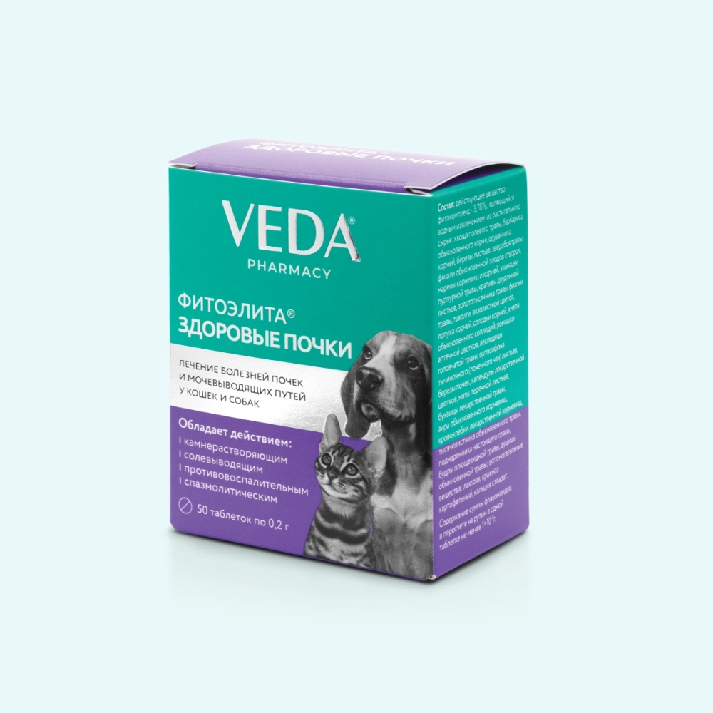 FITOELITE ZDRAVI BUBREZI sadrži kompleks lekovitih biljaka: Rap, žutika, maslačak, breza, kantarion, pasulj, broć, ljubičasta ehinacea, kopriva, kičma, ljubičica, livadar, čičak, sladić, hmelj, kamilica, lespedeza glavata, ortosifon stamineus, neven, nana, citrus, kanamus, hajdučka trava, lebdej, mleveni bršljan i origano. Biološki aktivne supstance ovih biljaka imaju diuretičko dejstvo, postepeno otvarajući kamence i urate nastale u bubrezima i bešici, olakšavajući njihovo izlučivanje. FITOELITE ZDRAVI BUBREZI se primenjuje oralno u sledećim dozama: Psi i štenci: 1 tableta na 10 kg telesne težine. Mačke: 1 tableta po životinji. Mačići: ½ tablete po životinji. Doziranje: U akutnim slučajevima, lek primenjivati svaka 2 sata tokom prvih 1-2 dana lečenja, a zatim 3 puta dnevno tokom narednih dana dok se akutni klinički znaci bolesti ne smire. Nakon što se težina bolesti smiri, nastaviti sa lečenjem 2-4 nedelje. U hroničnim slučajevima, primenjivati 3 puta dnevno tokom 2-4 nedelje. Uputstvo za upotrebu: Primenjivati sa malom količinom hrane (poslasticom) ili snažno na zadnji deo jezika. Uslovi čuvanja: Čuvati na temperaturi koja ne prelazi 25°C tokom 12 meseci.