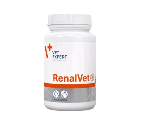 Sastav: 2.20.1 rafinisano sojino ulje Glicin mak. (L.) Merr., 11.1.1 kalcijum karbonat, 10.3.1 brašno od rakova Chionoecetes opilio (hitozan), 2.21.1 sirovi lecitin, 9.3.1 pčelinji vosak. Nutritivni dodaci (po kapsuli): 3a671 vitamin D3 80 IU. Uputstvo za pravilnu upotrebu: Mačke i psi do 10 kg t. – 1 kapsula dnevno. Psi preko 10 kg t. – 1 kapsula na svakih 10 kg t. dnevno. Vrh kapsule treba odvojiti ili iseći, istisnuti sadržaj i pomešati sa hranom ili dati direktno u usta. Životinje uvek treba da imaju pristup slatkoj vodi. Informacije o ishrani: Zbog većeg sadržaja vitamina D3 u poređenju sa potpunom hranom, RenalVet se može davati psima i mačkama u količini do 2,5% dnevnog obroka. Primenjen u vreme obroka, agens za heliranje fosfora efikasno smanjuje apsorpciju fosfora iz gastrointestinalnog trakta, snižava nivoe fosfora u serumu, smanjuje koncentraciju parathormona i smanjuje izlučivanje fosfora u urinu. Dodatak takođe sprečava potencijalne nedostatke vitamina D. Izuzetno ukusan, idealan je za životinje koje pate od gubitka apetita, što je najčešći simptom kod pacijenata sa zatajenjem bubrega i uremijom.