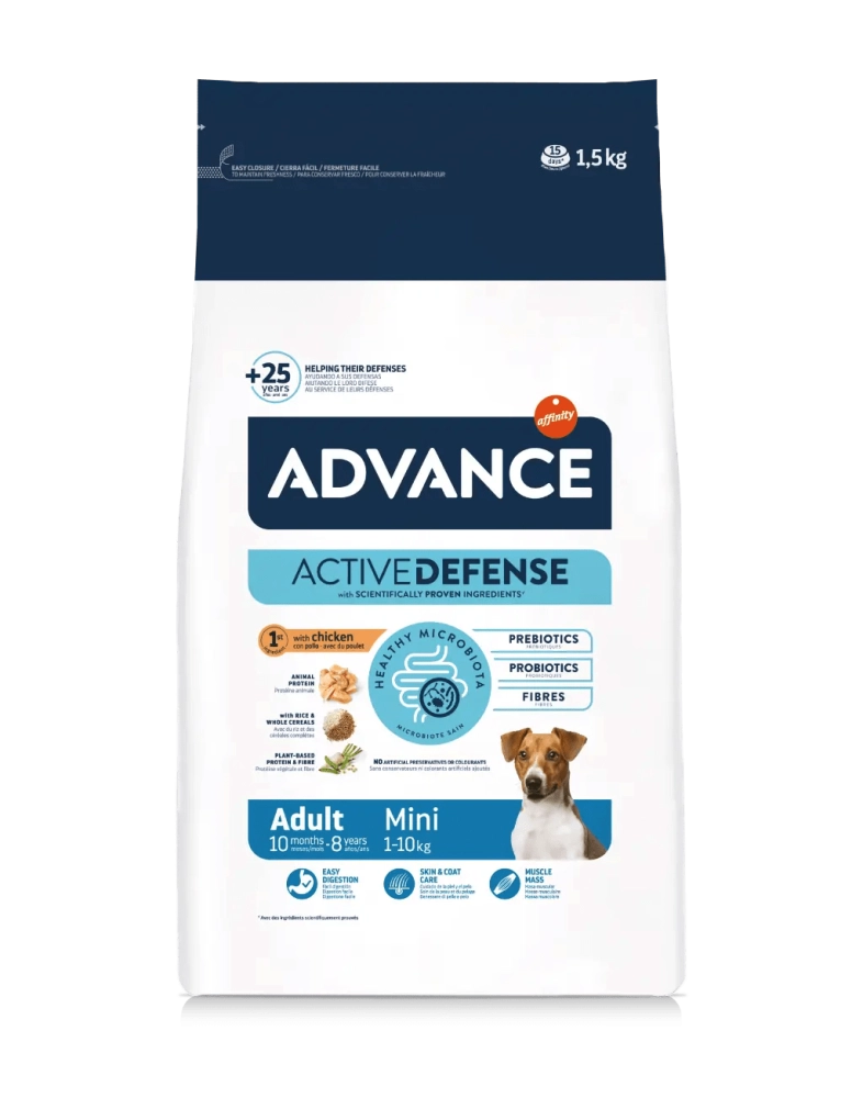 Advance Adult Mini je visokokvalitetna hrana koja je lako svarljiva i formulisana da zadovolji potrebe malih odraslih pasa. Napravljen sa piletinom kao prvim sastojkom. Pomaže u održavanju mišićne mase, zahvaljujući nivou visokokvalitetnih proteina i doprinosi zdravoj koži i sjajnoj dlaki, zahvaljujući omega 3 i omega 6 masnim kiselinama.