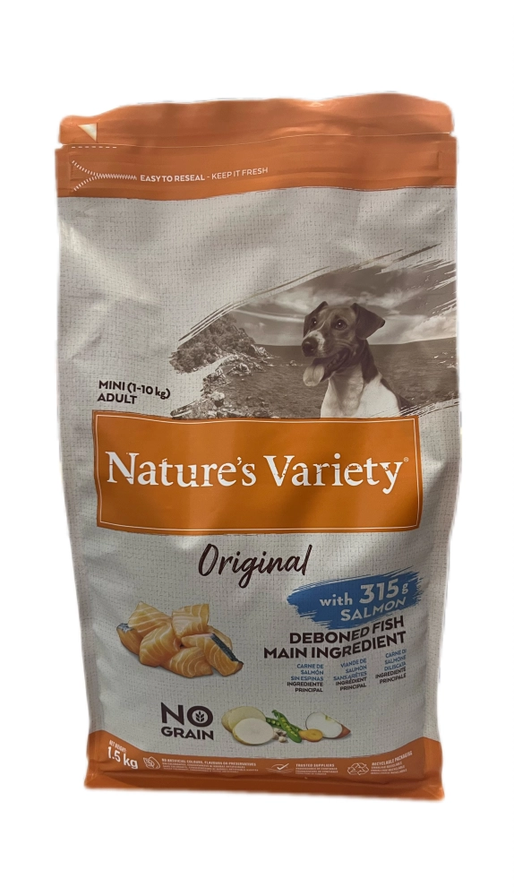 Nature\\\'s Variety original no grain losos je superpremium hrana bez žitarica na bazi svežeg lososa i dehidriranih proteina tunjevine. Namenjena je odraslim psima malih rasa. Zbog visokog sadržaja lososa i tune odlična je za kožu i dlaku psa.