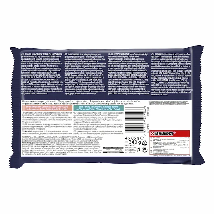 Kompletna hrana za odrasle mačke, sa ukusom lososa i tune, u želeu.