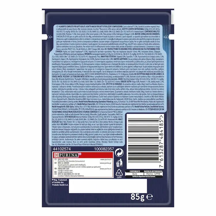 Za prosečnu odraslu mačku (4kg), hraniti sa 4 kesice dnevno u najmanje 2 odvojena obroka. Prosečne količine održavanja za odrasle, bazirane su na uobičajeno aktivnim mačkama pri normalnim temperaturama životne sredine. Individualne potrebe variraju i ishranu treba prilagoditi potrebama, kako biste Vašu mačku održali vitku, zdrave telesne težine. Servirati na sobnoj temperaturi. Čista, sveža voda za piće treba da bude dostupna sve vreme. Za prosečnu odraslu sterilizovanu mačku (4kg), hraniti sa 3 kesice dnevno u najmanje 2 odvojena obroka.