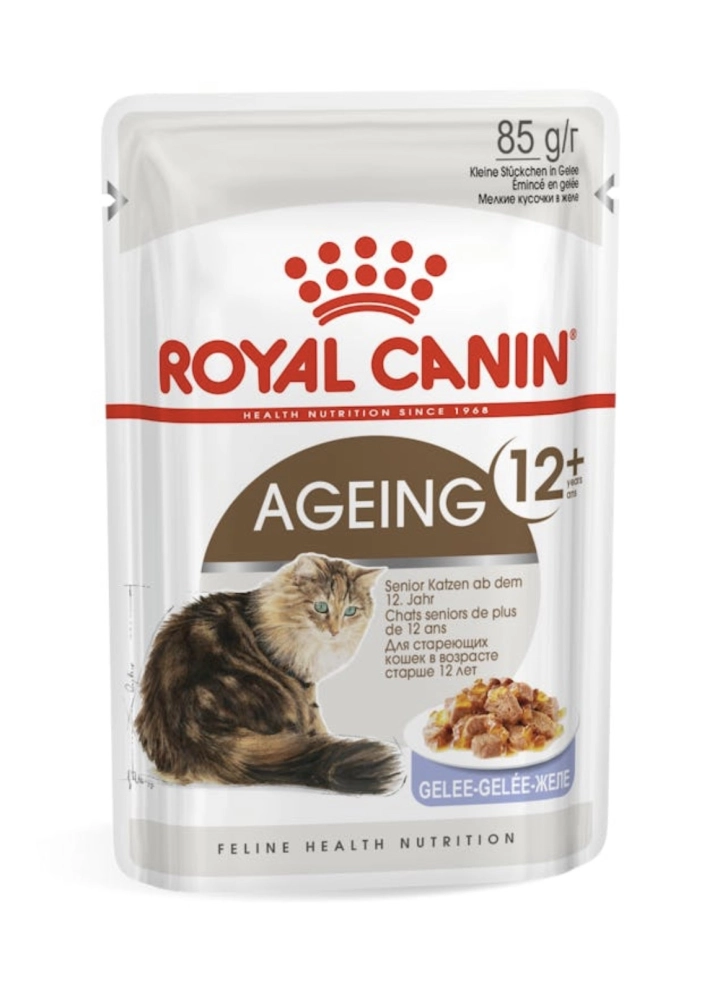 Ageing 12+ je vlažna hrana namenjena mačkama starijim od 12 godina koja sadrzi kompleks antioksidanata, EPA/DHA koji imaju umirujući efekat. Kombinacija glukozamina, hondroitina i masnih kiselina, podstiče očuvanje zdravih zglobova i održava njihovu funkciju i pokretljivost. Prilagođen nivo fosfora održava zdravlje bubrega.