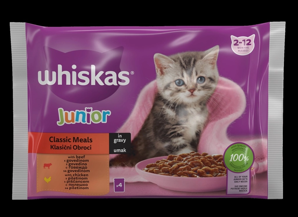 Kompletna hrana za mačiće starosti 2-12 meseci, sa ukusom govedine i piletine u sosu.