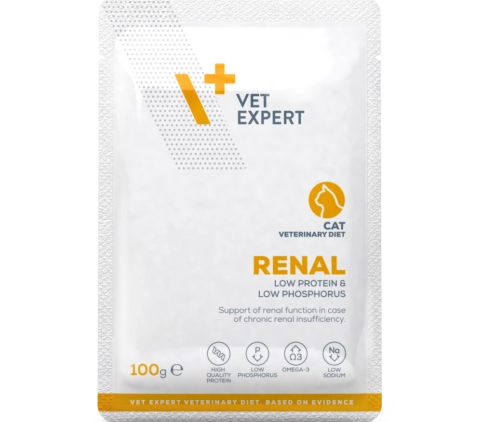 VISOKOKALORIČNI I MASNI – visok kalorijski sadržaj ishrane, koji potiče od masti sadržanih u mesu i lososovom ulju, obezbeđuje koncentrovanu količinu energije u obroku. Ovo je posebno važno kod hronično bolesnih mačaka sa smanjenim apetitom. SMANJEN SADRŽAJ PROTEINA – ograničen sadržaj visokokvalitetnih životinjskih proteina (piletina, govedina) omogućava optimalnu apsorpciju aminokiselina i njihovo efikasno korišćenje od strane mačjeg organizma bez preopterećenja bubrega proizvodima metabolizma azota. NIZAK SADRŽAJ FOSFORA – omogućava održavanje pravilnog metabolizma kalcijum-fosfata. Ovo smanjuje rizik od sekundarnog nutritivnog hiperparatireoidizma, taloženja kalcijuma u ćelijama i mogućeg napredovanja bolesti. OMEGA 3 MK – u lososovom ulju imaju efekat koji inhibira proizvodnju i aktivnost proinflamatornih faktora. Takođe pružaju dodatnu zaštitu bubrežnih glomerula, smanjujući sintezu proagregacionih i hipertenzivnih faktora. Sastav: meso i mesni nusproizvodi (26% piletina, 23% govedina), pirinač (6%), minerali (1%), ulje i masti (0,5% lososovo ulje). Izvor proteina: piletina, govedina. Nutritivni aditivi po kg: Vitamini: Vitamin A (3a372a): 3000 IU; Vitamin D3 (3a671): 200 IU; Elementi u tragovima: Cink (cink sulfat monohidrat; 3b605): 25mg; Mangan (manganov sulfat monohidrat; 3b503): 1,4mg; Jod (kalcijum jodat bezvodni; 3b202): 0,75mg; Bakar (bakar (II) sulfat pentahidrat; 3b405): 1mg; Provitamini: Taurin (3a370): 1500mg. Analitički sastojci: sirovi proteini 8%, sirove masti 7,5%, sirovi pepeo 2%, sirova vlakna 0,5%, vlaga 76%, Ca 0,2%, P 0,16%, Na 0,16%, K 0,29%, Omega-3 masne kiseline 0,2%, Omega-6 masne kiseline 0,8%, EM: 112,75 kcal/100g.