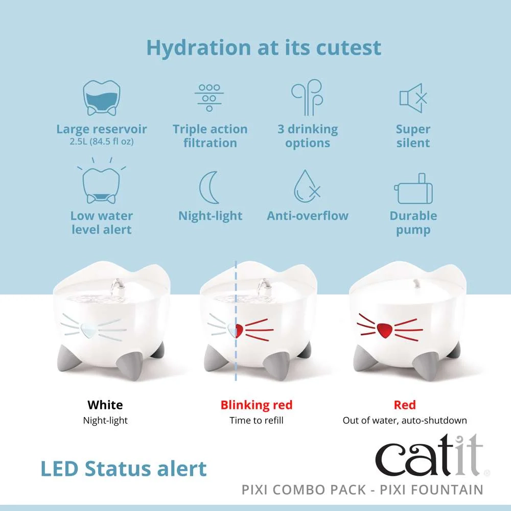 Catit PIXI fontana za piće kombinuje ergonomski dizajn sa preslatkim detaljima inspirisanim mačkama. PIXI-jine male šapice olakšavaju podizanje fontane radi dopunjavanja, dok njene vesele uši sprečavaju prskanje. Njen svetleći nos i brkovi služe i kao osvetljeni prozor za nivo vode i nežno noćno svetlo, obaveštavajući vas kada je vreme za dopunjavanje.