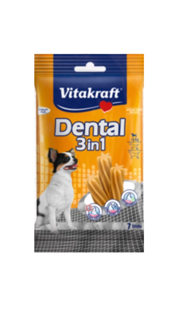 Zubni plak i kamenac česti su problem kod pasa. Ukusni štapići za negu zuba Dental 3u1 koji sadrže kombinaciju aktivnih elemenata: Aktivni element Stay Clean smanjuje razvoj bakterija odgovornih za stvaranje zubnog plaka. Dodatni pirofosfati na sebe vežu kalcijum koji se nalazi u slini, i usporavaju nastanak zubnog kamenca. Štapići takođe sadrže cink koji sprečava upalu desni i potpomaže zarastanje rana u čeljusti. Poseban oblik šestokrake zvezde i elastična konzistentnost štapića za negu zuba Dental 3u1 doprinose temeljnom čišćenju zuba, i pospešuju uklanjanje zubnog plaka i kamenca