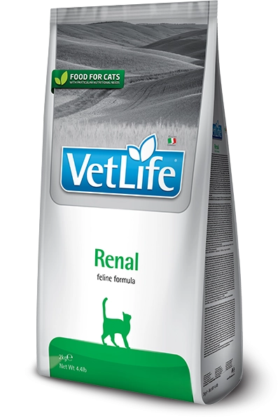 Hronična i akutna bubrežna insuficijencija, terapija kongestivne slabosti srca. Farmina Vet Life Renal je kompletna dijetetska hrana za mačke u slučaju hronične i akutne bubrežne insuficijencije. Ova hrana sadrži nizak nivo fosfora i proteina visoke biološke vrednosti.