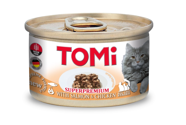 TOMi hrana za mačke koja razmazuje vašu mačku vrhunskim iskustvom jela. Sa zavodljivim nizom individualnih ukusa, recepata i tekstura – svaki pripremljen po najvišim kulinarskim standardima za mačke i dostupan u praktičnim porcijama za jednu porciju. TOMi 85 g superpremijum hrana za mačke je napravljena za mačke koje uživaju u najlepšim stvarima u životu. Ovaj obrok je apsolutno bez dodatog šećera, veštačkih boja ili aroma, a najvažnije je da ne sadrži GMO. U našem proizvodnom procesu ne koristimo antioksidante i konzervanse.